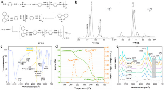 1,4-Phthalaldehyde (0.05 mol, 6.7 g) and ethanol (100 mL) were added to a three-necked flask and heated to 50 °C with mechanical stirring. After 1, 4-Phthalaldehyde was completely dissolved, hypophosphorous acid (0.05 mol, 6.6 g) was added to the flask and the temperature was increased to 90 °C for 12 h. DOPO (0.05 mol, 10.8 g) was then added to the flask and the reaction was continued for 12 h and then cooled to room temperature. AlCl3·6H2O (0.017 mol, 4.1 g) was dissolved in an appropriate amount of distilled water which was then added to the flask, and the mixture was heated at 90 °C for 8 h. Most of the solvent was removed under reduced pressure to give a yellow oily liquid, which was washed three times with an ethyl acetate/petroleum ether (1:1) mixture. Drying at 80 °C for 2 h in a vacuum oven gave a pale-yellow solid which was triturated to afford a white powder, and washed with distilled water to neutral, and then the product was vacuum dried at 80 °C for 12 h. The yield was 82%. The synthetic route of HPDAl was presented in Figure 2a. The n value representing the degree of polymerization in Figure 2a was 0.22.