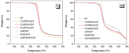 The thermal decomposition behavior of the pure EP and EP composites was investigated and the results are shown in Figure 3 and Table 2. It was revealed that the addition of all flame retardants lowered the initial decomposition temperature of EP and increased the char residues to varying degrees. Moreover, with an increasing HPDAl content, the initial decomposition temperature of composites tended to decrease and the residual carbon yield at high temperature increased accordingly. Even 3 wt.% loading of HPDAl caused a significant increase in the composite residual char yield, approximately 40% higher than that of pure EP. These results account for why adding different amounts of HPDAl resulted in different blowing-out effects, as shown by the UL 94 tests. In addition, compared with DOPO/EP and AHP/EP, 2%HPDAl/EP and AHP/DOPO/EP possessed more carbon residues and further investigation showed a synergistic charring effect, promoting the matrix to form more high-temperature thermal-stable char residues regardless of the combination type, intramolecular or intermolecular, between DOPO and AHP groups. It was also worth mentioning that the thermal decomposition behaviors of pure EP and EP composites under nitrogen and air atmospheres were approximately the same, but a new degradation stage appeared at 600 °C under air, which can be assigned to the further decomposition of the char residue.