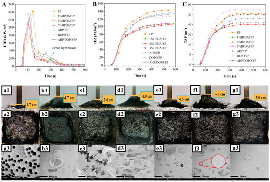 HRR (A), THR (B) and TSP (C) curves of EP and EP composites, macroscopic photos and SEM images (×500) of residues for EP (a1–a3), AHP/EP (b1–b3), DOPO/EP (c1–c3), AHP/DOPO/EP (d1–d3), 1%HPDAl/EP (e1–e3), 2%HPDAl/EP (f1–f3) and 3%HPDAl/EP (g1–g3) after cone test.