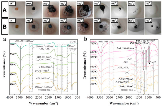 Digital photographs and residual char FTIR spectra of EP (A,a) and 2%HPDAl/EP (B,b) after being maintained at different temperatures for 15 min in a muffle furnace.