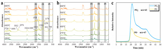 Meanwhile, the FTIR tests of EP and 2%HPDAl/EP residues maintained in the muffle furnace at different temperatures were performed, and the curves are shown in Figure 5a,b. Some structural information of the char residues was revealed: -OH or -NH (3430 cm−1 and 1620 cm−1), -CH3 (2960 cm−1), -CH2 (2850 cm−1), C-O-C (1265-1010 cm−1), C=O (1740 cm−1), C-N (1320 cm−1), and benzene ring (1510-1450 cm−1, 815 cm−1, and 740 cm−1) [35]. The big difference was that P=O (1200 cm−1), P-O (1120 cm−1), and P-O-C (919 cm−1) appeared in 2%HPDAl/EP, and there were still intense absorption peaks up to 700 °C. This indicates that HPDAl participated in the char-forming reaction of the matrix and formed abundant cross-linking structures containing P-O-C bonds, thus strengthening the char residues. This can be attributed to the fact that HPDAl decomposed into a non-flammable viscous phosphoric acid liquid film covering the resin surface upon heating, and the glassy polyphosphoric acid produced by further dehydration polymerization of phosphoric acid was able to catalyze the dehydration of -OH-containing compounds to form char layers [36]. In addition, Al3+ reacted with O=P-O- to generate aluminum pyrophosphate, aluminum polyphosphate, aluminum metaphosphate, etc., further promoting the dehydration of polymer chains to form a high-quality char layer in the condensed phase.