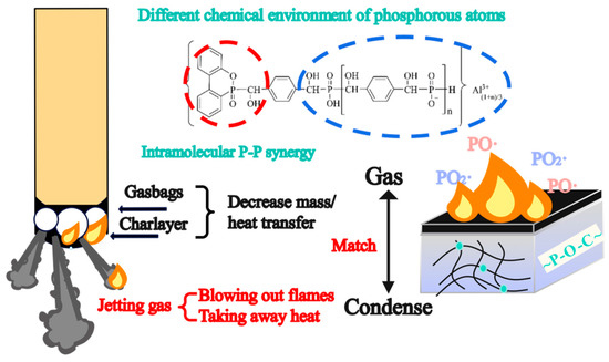 Phosphorus-based compounds, as promising halogen-free flame retardant candidates, have increasingly attracted extensive attention [1,2,3,4,5,6]. Generally speaking, previous results have shown that phosphorus flame retardant can work in both the condensed and gas phase, whilst its relative predominance depends on the chemical environment of the P atom (phosphorus valency or oxidation state, and the nature of chemical moieties surrounding the phosphorus atom) and the structural characteristics of the matrix [7,8]. The increasing oxygen environment of the P atom and its higher phosphorus valency in compounds result in an increasing charring effect, which is caused by the fact that the produced polyphosphoric acid catalyzes the formation of a protective carbonaceous layer, i.e., a condensed-phase flame retardant mechanism. On the other hand, an increasing carbon or hydrogen environment of the P atom and lower phosphorus valency contribute to a flame inhibition effect through a radical trapping mechanism, which is a predominantly gas-phase flame retardant activity, as previously mentioned in many studies [6,9]. These flame retardants decompose to produce small low-energy phosphorus-based radicals quenching the high-energy hydroxyl or hydrogen radicals from polymer decomposition in the vapor phase, thus interrupting the flame propagation. Certainly, the ability of a phosphorus-based flame retardant to be in the vapor phase or condensed phase is also a function of what type of polymer it is put into, in addition to its chemical structure. Previously, our lab constructed a series of novel bi-group molecules, which exhibited a remarkable intramolecular group synergistic effect when the groups were integrated into one molecule [10,11,12]. Investigations of this synergy would provide insights into how the flame retardant efficiency of phosphorus-based compounds could be improved. Indeed, some works have reported that one flame retardant molecule consisting of two different phosphorus-based groups with different phosphorus valency could obtain a group or P-P synergy of modes of action [13]. Phosphophenanthrene (DOPO) and phosphonitrile groups were introduced into the same molecule in the form of chemical bonding, named HAP-DOPO, for flame retardant epoxy resin, which can form phosphorus-rich residues carbon while releasing PO·, showing a better flame retardant effect than when added alone or physical mixed [14]. A bi-functional compound containing two phosphorus-based moieties—DOPO and phosphonate—was prepared, and the two phosphorus-containing groups decomposed in sequence with increasing temperature, continuously releasing PO free radicals with a quenching effect in the gas phase and forming viscous residues to bond and integrate other char species with a high barrier effect in the condensed phase, enhancing the flame retardancy of matrix [15]. However, the amount of added flame retardants was sufficiently high to achieve the desired flame-retardant properties, i.e., low flame retardant efficiency.