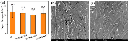 The high-temperature curing epoxy thermoset materials were often required to possess certain mechanical properties. Therefore, the impact of HPDAl on the mechanical properties of epoxy composites was studied by the Charpy impact test. The results are manifested in Figure 8a. Generally, the compatibility of hypophosphite with polymers was not satisfactory, so the mechanical properties of materials would be greatly deteriorated after adding hypophosphite. However, from the results of the impact experiments, the addition of HPDAl exerted a slight influence on the mechanical properties of resin matrix. This was mainly because the HPDAl containing -OH functional groups was connected to resin chains through the curing reaction, increasing the compatibility between the flame retardant and epoxy resin, thus improving the impact resistance of composites. Furthermore, the microtopography of the impact fracture surface revealed some microstructure information, as shown in Figure 8b,c. The impact section of the pure EP exhibited a band-like texture area, accompanied by the curling of the edges, which reflected the toughness of the material. 2%HPDAl/EP had a texture similar to pure EP, which corroborated the addition of HPDAl and had no significant damage on the impact property of the matrix from the perspective of microstructure.