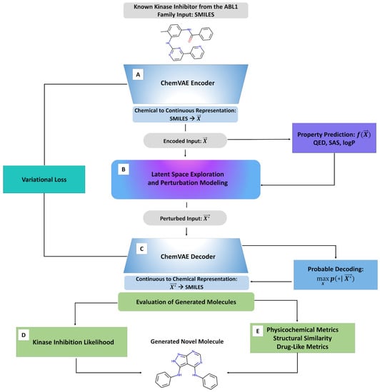All scripts, software, and models used in the development and experiments are available in the GitHub site https://github.com/kassabry/Perturbation_Experiment (accessed on 27 August 2022). The GitHub repository contains the framework and code for molecular transformations of kinase inhibitors using generative learning methodologies and targeted perturbation modeling. The GitHub site provides detailed documentation and guide of the deposited information and software. The deep learning frameworks are supported by the TensorFlow backend [] and python tools such as NumPy, SciPy, pandas, and scikitlearn. The developed software used to conduct PCA analysis and visualization of the latent space is contained in the perturbation experiment python notebook. The developed software for the use of the variational autoencoder integrated with the perturbation approach is contained in the perturbation experiment python notebook. More information on these files and how to perform the initial setup of the environment can be found in the GitHub README file.
