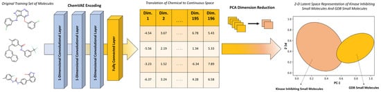 A schematic overview of the adaptation of ChemVAE-enabled transformation of chemical structures to the latent continuous space. PCA dimensionality reduction is used to transform the input from 196 dimensions to two dimensions. The 2D visualization of the latent space highlights differences between the spaces of GDB-17 small molecules and kinase inhibitors.