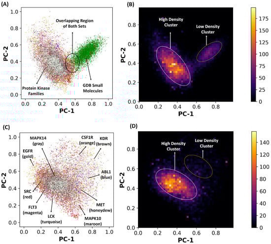 For the training datasets of small molecules, we employed a fraction of the GDB-17 database version (GDB database release, 9 August 2021, https://zenodo.org/record/7041051#.YypEcbTMI2w (accessed on 6 October 2021)) corresponding to small molecules from a variety of domains, with the following atoms (C, N, O, S, F, Cl, Br, P, I) [,]. For the datasets of kinase chemical probes we used (a) ~20,000 known kinase inhibitors representing 10 major kinase families SRC, ABL1, CSF1R, EGFR, FLT3, KDR, LCK, MAPK10, MAPK14, and MET that were obtained from ZINC15 database [] and (b) a dataset of competitive and allosteric protein kinase inhibitors confirmed by X-ray crystallography that contained a total of 2899 unique inhibitors including 136 allosteric and 2763 orthosteric compounds with a total of 231 protein kinases []. The kinase inhibitors set included 1883 unique ABL1 kinase inhibitors and 3477 unique SRC kinase inhibitors. By encoding a set of GDB-17 molecules and a set of kinase inhibitors using ChemVAE framework data, every molecule was transformed into a 196-dimensional vectorial representation in the continuous space. The 196-dimensional vectors representing these molecules were then fed through principal component analysis (PCA) so that we could visualize the continuous space in two dimensions and analyze different regions (Figure 1).