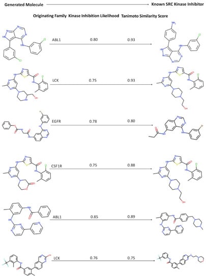 A selected sample of the generated molecules obtained using the perturbation approach and displaying the high kinase inhibition likelihood and considerable similarity to the existing SRC kinase inhibitors. (Left panel) The generated molecules along with the indication of the respective originating kinase family. (Right panel) The known SRC inhibitor to which the generated molecule has the highest similarity score to. The kinase inhibition likelihood score of the generated molecule and the similarity score between the known SRC inhibitor and the generated molecule are shown.