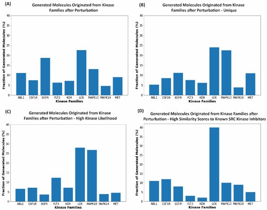 Analyses of the generated molecules. The histograms represent the fraction of the generated valid molecules with respect to the originated kinase inhibitor families. The horizontal axes represent the kinase inhibitor families from where the transformed output originated from. The vertical axes represent the percentage of molecules for each family from the set of molecules generated after each stage of evaluation. (A) The percentage of the generated molecules from each family after the initial perturbation experiment. (B) The percentage of the generated molecules from each family after removing the duplicate molecules. Due to the stochastic nature of the variational autoencoder, there are some molecules that are produced multiple times. (C) The percentage of generated molecules from each family that feature kinase inhibition likelihood probability score > 0.75. (D) The percentage of molecules from each family with the high kinase inhibition likelihood probability score and high similarity scores to the known SRC kinase inhibitors. The generated molecules considered in this analysis are in the top one hundred molecules of the high Tanimoto similarity [] scores (>0.6) to the known SRC kinase inhibitors.