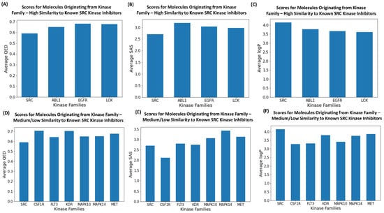The analysis of drug-like properties for the generated molecules. (A) The average QED values for generated molecules originated from inhibitors of the 3 kinase families and comparison with the QED values for SRC kinase inhibitors. The generated molecules produced the highest similarity scores to the known SRC kinase inhibitors. (B) The average SAS values for generated molecules originating from inhibitors of the 3 kinase families and comparison with the SAS values for the SRC kinase inhibitors. The generated molecules produced the highest similarity scores to the known SRC kinase inhibitors. (C) The average logP values for generated molecules originating from inhibitors of the 3 kinase families and comparison with the logP values for SRC kinase inhibitors. The generated molecules produced the highest similarity scores to the known SRC kinase inhibitors. (D) The average QED values for generated molecules originating from inhibitors of the 3 kinase families and comparison with the QED values for SRC kinase inhibitors. The generated molecules produced medium/low similarity scores to the known SRC kinase inhibitors. (E) The average SAS values for generated molecules originating from inhibitors of the 3 kinase families and comparison with the SAS values for SRC kinase inhibitors. The generated molecules produced medium/low similarity scores to the known SRC kinase inhibitors. (F) The average logP values for generated molecules originating from inhibitors of the 3 kinase families and comparison with the logP values for SRC kinase inhibitors. The generated molecules produced medium/low similarity scores to the known SRC kinase inhibitors.