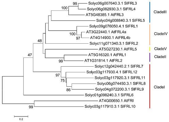 The Genome Database of Arabidopsis (http://www.arabidopsis.org; accessed on 16 January 2016) and Genome Database of Tomato (https://solgenomics.net/; accessed on 16 January 2016) were used to obtain FRIGIDA and its homologous proteins. To download the protein sequence of the candidate gene, the BLAST tool was used to perform homologous gene blast analysis, and MEGA8 software was used to construct a phylogenetic tree. Tomato FRIGIDA-LIKE homologous genes (SlFRLs) were obtained according to the distance and clustering of each clade of the phylogenetic tree. To confirm the mRNA level of SlFRLs in specific tissues for the highest expression, the Tomato Functional Genome Database (http://ted.bti.cornell.edu/cgi-bin/TFGD/digital/home.cgi) was used. For further processes, the protocol previously described was used [46].