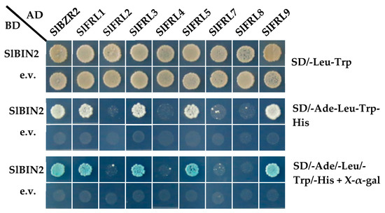 To confirm whether SlFRLs interact with SlBIN2, we performed a yeast two-hybrid assay. The functional genomic database (http://ted.bti.cornell.edu/cgi-bin/TFGD/digital/home.cgi; accessed on 16 January 2016) was used to find the site of SlFRLs, and they were then extracted from the point with the highest expression. Eight of them (SlFRL1, 2, 3, 4, 5, 7, 8, and 9) were cloned successfully. All of the 8 SlFRL CDS sequences are recombined into a pGADT7 vector, double digested by EcoR I/BamH I, fused with the BD-SlBIN2 vector and transformed into a yeast cell AH109. The cells were cultured at 30 °C on a four-deficient solid medium (SD/-Ade-Leu-Trp-His) for four days, and then the healthy colonies were selected and cultured for a further four days. Results (Figure 2) indicated that AD-SlFRLs and BD-SlBIN2, positive controls AD-SlBZR2 and BD-SlBIN2, and negative controls AD-SlFRLs and BD-Empty have normal growth on two-deficient medium, indicating that each fusion yeast strain grows well. However, AD-SlFRL1 and BD-SlBIN2, AD-SlFRL3 and BD-SlBIN2, AD-SlFRL5 and BD-SlBIN2, AD-SlFRL9 and BD-SlBIN2 were found on four-deficient medium and color indicator medium. SlBIN2 and the positive control can grow normally and show blue color on solid medium containing X-α-gal. Results were stable and proved that SlFRL1, SlFRL3, SlFRL5, and SlFRL9 could interact with SlBIN2 in vitro.