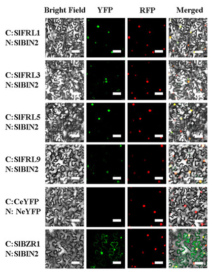 Results of the yeast two-hybrid assay proved that four members, SlFRL1, SlFRL3, SlFRL5, and SlFRL9, can interact with SlBIN2 in vitro. To further investigate whether these four SlFRLs interact with SlBIN2 in vivo, these four SlFRLs and SlBIN2 were constructed in pER8-NeYFP and pER8-CeYFP and after the transformation of Agrobacterium, with the helper strain P19, and pBI121-35S-Nls-DsRed (labeling the nucleus under red fluorescence excitation) strains according to 1:1:1:1. To induce expression, 1 μM β-estradiol was sprayed each day, and after three days, confocal microscopic observation was carried out. According to the results (Figure 3), upon excitation of yellow fluorescence, it can be seen that the combination of SlFRL-NeYFP and SlBIN2-CeYFP has nuclear-like fluorescence. Similarly, the positive controls SlBZR1-NeYFP and SlBIN2 and the combination of CeYFP showed fluorescence in the nucleus and cell membrane. On the other hand, no fluorescence was found in negative controls, which indicated that BIN2 interacts with all four SlFRLs in tobacco leaf epidermal cells. It can also be noticed that under red fluorescence, upon excitation, the combination of SlFRL-NeYFP and SlBIN2-CeYFP appears to demonstrate red fluorescence. It can be seen that the fluorescence is located in the nucleus due to the nuclear localization feature of nuclear localization signals. These results together with the results of the yeast two-hybrid assay demonstrated that these four SlFRLs can interact with SlBIN2 in vitro and in vivo.