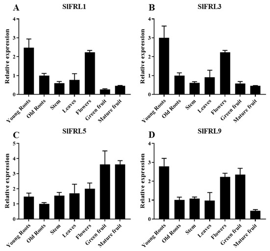 To explore the expression of SlFRLs in different plant parts, total RNA from various parts, such as stems, young leaves, flowers, young and old roots, ripe green fruits, and red ripe fruits of tomato MT-d+, was extracted from 8-week-old seedlings. It was reverse transcribed in cDNA and analyzed by quantitative fluorescence PCR. Results (Figure 4) demonstrated that SlFRL1 is highly expressed in young roots and flowers; the lowest expression of SlFRL1 was noticed in green fruits. SlFRL3’s higher expression was similar to SlFRL1, while lower SlFRL3 was found in mature fruits. SlFRL5 has a different pattern of expression, as the highest expression was noticed in fruits, while lower expression was observed in old roots. In the case of SlFRL9, young roots have the highest expression, followed by flower and green fruit, while the lowest was found in mature fruits. Overall results show that SlFRLs are highly expressed in flowers and young roots.