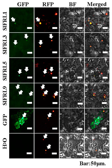 Previous studies showed that AtBIN2 is localized in the cytoplasm and nucleus, and AtFRI is localized in the nucleus. However, SlFRLs were still unknown where they localized. To verify SlFRLs’ subcellular localization, the tobacco leaves were injected with activated (OD600 = 0.5) mixed strain (35S::SlFRLs-GFP + 35S::NLS-DsRed + P19) and GFP empty as a positive control, while H2O served as a negative control. According to the results shown in Figure 5, all the four SlFRLs (1, 3, 5 & 9) showed nuclear fluorescence upon excitation of green fluorescence. While under excitation of red fluorescence, nuclear fluorescence also appeared. The nuclear fluorescence under GFP all coincided with those under RFP, which proved that the four SlFRLs were all located in the nucleus.
