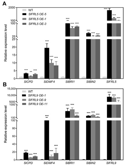 Two basic components of BR synthesis are SlCPD and SlDWF. Increases in their level will reflect the decrease in BR signaling strength for the plant signaling feedback regulation. Similarly, SlBIN2 is a core negative regulator of BR signaling, and increases in its level will inhibit BR signaling. The mRNA levels of SlCPD, SlDWF and SlBIN2 were determined in SlFRL5 and SlFRL9 overexpression lines and wild type lines. The results in Figure 6 suggested that the mRNA level of SlBIN2, SlCPD, and SlDWF in SlFRL5 and SlFRL9 overexpressed lines were significantly higher than that in wild type lines. These results indicated that SlFRL5 and SlFRL9 reduced BR signaling levels in tomatoes.