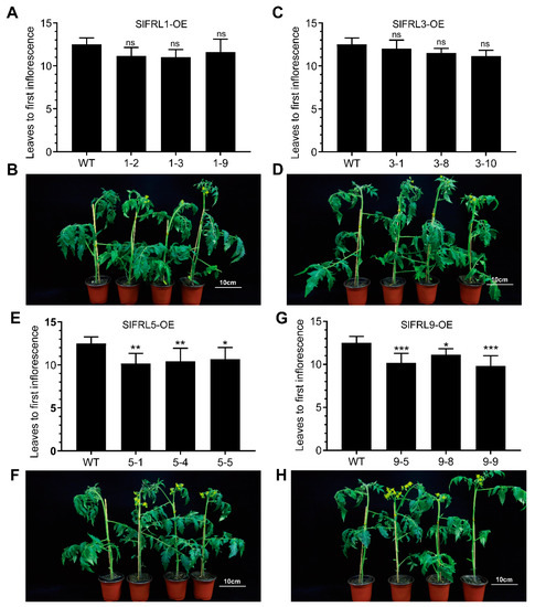 In Arabidopsis, FRIGIDA and its homologous proteins promote the expression of FLC, which inhibits FT expression, leading to the promotion of late flowering. Late and early flowering was determined based on counting the number of true leaves under the first panicle in tomatoes. We also use the same method for SlFRL overexpression material and wild type plants [27]. The results shown in Figure 8 indicated that plants of SlFRL5- and SlFRL9-overexpressed lines had a decreased flowering node position. This suggested that SlFRL5 and SlFRL9 promote early flowering in tomato.