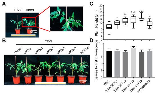 Transient silencing of SlFRLs promotes plant height in tomato. (A) was the phenotype of TRV2-SlPDS plants and their albino leaves, (B) was the phenotype of transient transformation materials at 4 weeks, (C,D) was the plant height at 4 weeks of each material in (B) and the number of true leaves under the first panicle. TRV-SlFRL4X is a mixture of TRV-SlFRL1, TRV-SlFRL3, TRV-SlFRL5 and TRV-SlFRL9. n ≥ 8. In the figure one star (*) stand for 5% level of significance while 2 stars (**) for 1% and 3 stars (***) for 0.1% level of significance.