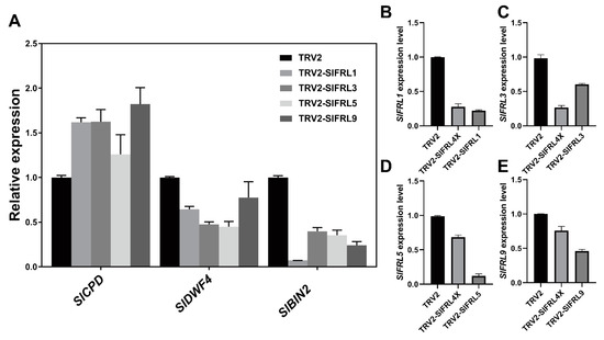 Virus-mediated gene silencing (VIGS) was used to obtain transiently silenced SlFRL tomato plants. Albino type leaves were found in TRV2-SlPDS positive plants, indicating that the VIGS silencing test for SlPDS was successful. TRV2-SlFRLs transiently transformed plants (Figure 9B), and TRV2-SlFRL4X is a mixed infection of four TRV-SlFRL strains. To confirm silencing, we performed RT-qPCR. Reduced mRNA levels were observed in each silencing line, indicating transient silencing of SlFRLs (Figure 9B–D). After growing these lines for four weeks, plant height was measured for each line. It was found that the plant height was increased in all silenced lines as compared to negative controls. Additionally, the number of true leaves was counted after the first panicle at flower blooming. However, no significant difference was noticed in flowering time. The results indicated that silencing of SlFRLs in tomato plants increased plant height, but flowering time was not affected by SlFRLs silencing. Furthermore, mRNA levels of SlBIN2, SlCPD, and SlDWF were also determined in these silenced lines (Figure 9A). In these lines, the transcription level of SlCPD was increased significantly, while the transcription level of SlBIN2 and SlDWF was decreased (Figure 10).