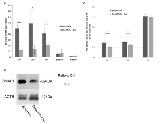 The prostate is a male reproductive gland responsible for 30–35% of semen composition with a pass through for the urethra. Prostate weights are usually less than 20 g in adults, while the exact size varies by individual [3]. Mid-to-late life mechanisms of enlargement mainly occur through hormones such as testosterone and estrogen [4] but also through inflammation [5], oxidative stress [6] and insulin resistance [7]. However, any associations between clock genes and prostatic growth via the modulation of these causative processes are largely unknown. To investigate such a role for peripheral clock genes in prostatic hyperplasia, the isolation of mechanistic pathways through targeted deletions has become a standard process for molecular studies. For example, the global Bmal1 knockout mouse is characterized by decreased testosterone production in Leydig cells associated with increased luteinizing hormone [8,9]. However, even with these methods, the direct influence of clock genes on hyperplasia or other types of proliferative growth is still obscure in the prostate [8,10].
