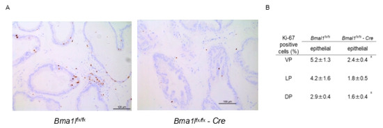 Ki-67 immunostaining of mouse prostates. (A) Representative image of 20-week-old mouse prostate (VP). (B) Percentage of Ki-67-positive cells; N = 6 each. * p < 0.05 using Student’s t-test.