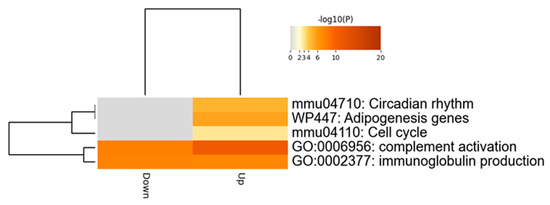 To reveal the mechanisms of how Bmal1 knockout produces smaller prostate sizes and weights, a cap analysis of gene expression (CAGE) was performed. The gene expression of the DLPs of 20-week-old mice was comprehensively compared between pBmal1 KO mice and control Bmal1fx/fx mice. As expected, the knockout of Bmal1 affected the expression of major clock genes as follows: Npas2, Cry1 and Rorc were upregulated. The differentially expressed gene (DEG) analysis identified 42 upregulated genes and 24 downregulated genes induced by the knockout (Table 1). Furthermore, the enrichment analysis using Metascape demonstrated that cell-cycle-related genes were significantly altered (Figure 3), hinting at a potential relationship between Bmal1 and cell cycles in the prostate. Additionally, Cdkn1a, a gene encoding p21, was upregulated in pBmal1 KO mice.