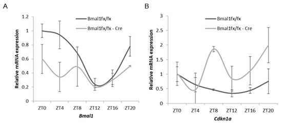 - Gréchez-Cassiau, A.; Rayet, B.; Guillaumond, F.; Teboul, M.; Delaunay, F. The circadian clock component BMAL1 is a critical regulator of p21WAF1/CIP1 expression and hepatocyte proliferation. J. Biol. Chem. 2008, 283, 4535–4542. [Google Scholar] [CrossRef]
