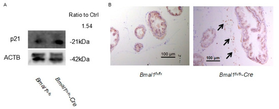 Representative images of protein expression levels of p21 in the prostate. (A) Immunoblotting of dorsolateral prostates at ZT16. (B) Immunohistochemistry of ventral prostates. Stromal cells showed positive staining in pBmal1 KO mice (shown by arrows) but little in Bmal1fx/fx mice.