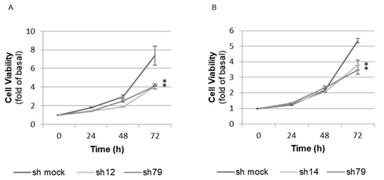 Proliferation assay (WST-8 assay) in BMAL1-knockdown immortalized human prostate cells. (A) Prostate epithelial cells, RWPE-1. (B) Prostate stromal cells, WPMY-1. Both BMAL1-knockdown cells showed more delayed proliferation than mock cells. * significantly decreased with respect to the control. p < 0.05 using one-way ANOVA with Tukey’s post hoc test (n = 3).