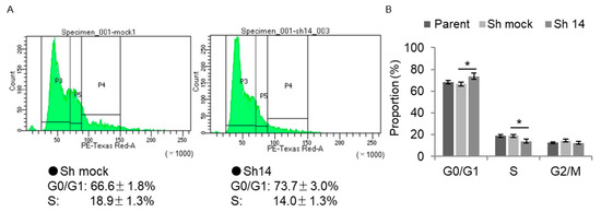 Cells were harvested, washed with cold PBS and fixed with 70% ethanol. The fixed cells were incubated with 500 μL of propidium iodide (PI; 1 mg/mL), followed by cell-cycle analysis using BD FACSAria III (Becton, Dickinson and Company, Franklin Lakes, NJ, USA).