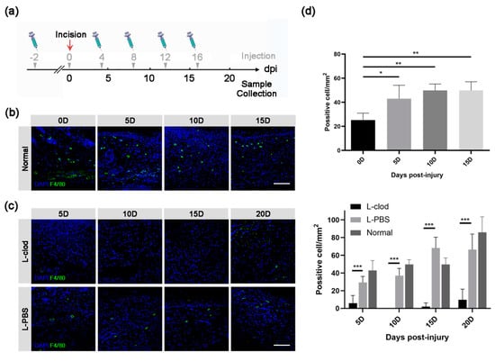 The distribution of macrophages during wound healing process before or after the depletion treatment. (a) Schematic diagram of macrophage depletion strategy. Gray arrowheads and numbers above the axis indicate L-clod or L-PBS injection time points, while black numbers below represent sample collecting days. The full-thickness skin incision was done at 0 dpi, which is represented as a red arrow. Macrophages in lesion skin tissues of either untreated (b) or L-clod- and L-PBS-treated (c) mice were detected by anti-F4/80 antibody (scale bar: 80 µm) and counted. The statistical result is presented as mean ± SD in subfigure (d) (upper: untreated, lower: L-clod-treated, L-PBS-treated, and untreated Normal groups. n ≥ 3. * p < 0.05, ** p < 0.01, *** p < 0.001).