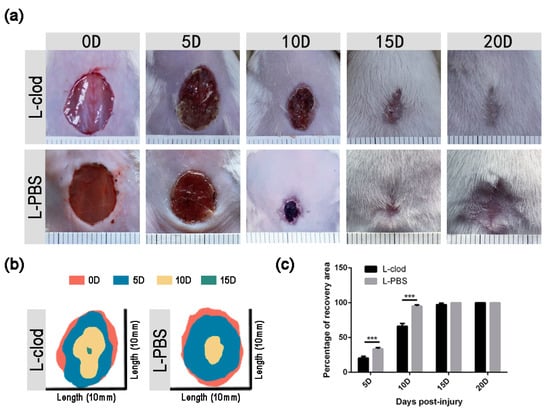 Wound healing in L-clod and L-PBS-injected mice. (a) Macroscopic appearance of wound sites from mice treated with either L-clod or L-PBS at different time points. (b) Schematic diagram of injury site changes over time. (c) Quantification of the recovery rate. The open wound area was measured using Image J and represented as percentage of recovery area as described in the Materials and Methods section (n ≥ 3. *** p < 0.001. Data presented as mean ± SD).