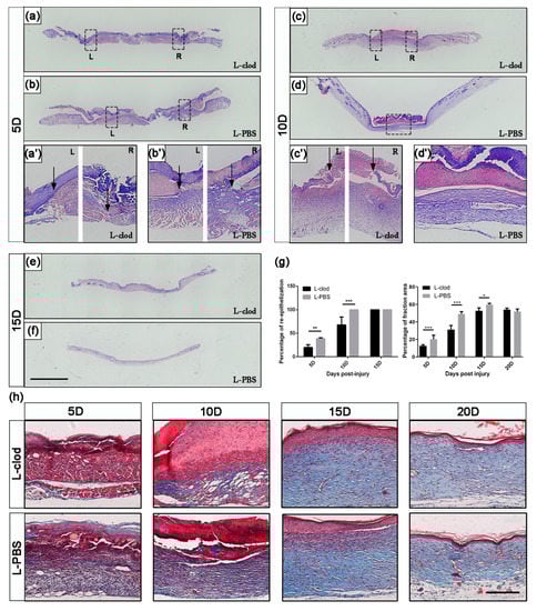 H&E staining was then used for detailed analysis. The control mice showed a higher wound closure percentage, with all wounds closed at 10D, whereas mice from the treatment group displayed significantly delayed wound closure at 5D (19.73 ± 6.05% L-clod vs. 38.50 ± 1.95 L-PBS, p < 0.01, Figure 3), and all of them failed to complete wound closure by the end of 10D (67.63 ± 17.18% L-clod vs. 100% L-PBS, p < 0.001, Figure 3a–g). The repair trends of the two groups obtained by H&E staining corroborated the macroscopical observations that the repair rate of the experimental group was significantly decreased.