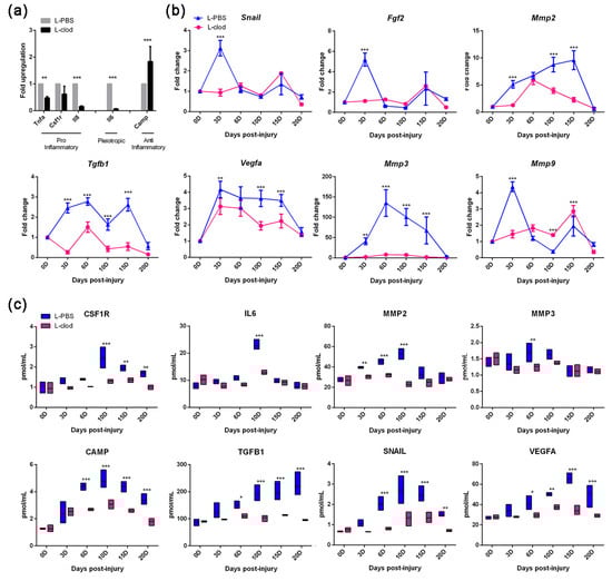 To study the mechanism of how macrophage depletion affected the wound healing process, we evaluated the expression of the genes/proteins known to be involved in the skin repair process. By examining molecular profiles at 3D, we detected decreased expression of the macrophage chemoattractant Il8, the pro-inflammatory genes Tnfα and Csf1r, and the pleiotropic cytokine Il6, as well as increased expression levels of the antimicrobial peptide Camp in tissue homogenates in the treatment group (Figure 4a). During the healing process, the regeneration-associated gene profiles were modulated after the injection of L-clod (Figure 4b). The key regulator of angiogenesis, Vegfa, which is predominantly expressed by macrophages [,], was observed to be downregulated in mice injected with L-clod. The depletion of macrophages also caused diminished expressions of Tgfb1, Mmp2, and Mmp3 during the healing process. Relatively low expressions of Snail, Fgf2, and Mmp9 at 3D were also detected. The results of ELISA experiments showed that the protein expression profiles of these growth factors were consistent with the expression profiles at the gene level (Figure 4c).