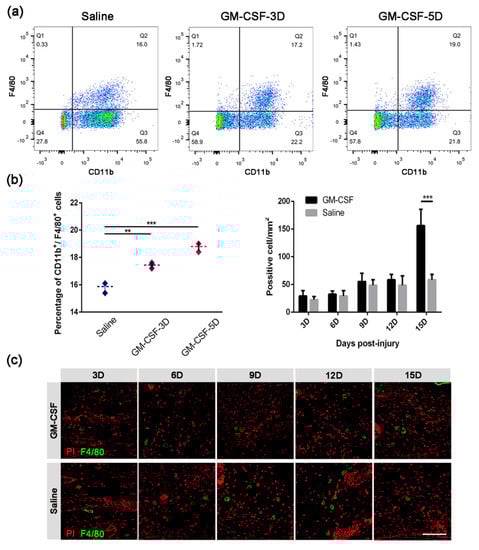 Based on the above results indicating that macrophages did participate in the process of skin repair, we assumed that artificially enhanced macrophage proliferation and differentiation would probably accelerate the skin healing process. GM-CSF is well known as a pro-inflammatory factor that promotes the recruitment of myeloid cells for their survival and activation at inflammatory sites []. We thus firstly subcutaneously injected GM-CSF into mice and tested its stimulating effect on macrophages in the peripheral blood by flow cytometry. FACS analysis showed that the percentage of macrophages was significantly increased after only one dose of GM-CSF injection, and another dose of injection contributed to the enhancement of the drug effect (Figure 5a,b, left). We then analyzed the mobilization effect of GM-CSF by quantifying macrophages in skin tissues from both the GM-CSF injection group and the control group at different time points, and we found that the skin tissues of GM-CSF injected mice contained more F4/80+ cells than those of the control group at each time point (Figure 5b, right and Figure 5c). These results indicated that the GM-CSF injection treatment resulted in a rising number of macrophages in both the peripheral blood and the injured skin tissue at the wound site.