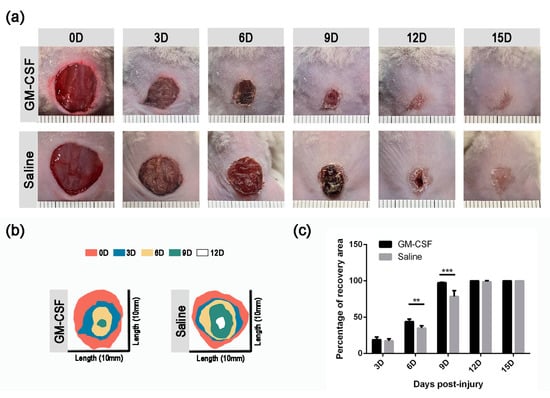 Wound healing of saline- and GM-CSF-injected mice. (a) Macroscopic appearance of wound sites from GM-CSF-treated and control mice. (b) Schematic diagram of injury site changes over time. (c) Quantification of the percentage of recovery area rate (n ≥ 3. ** p < 0.01, *** p < 0.001. Data presented as mean ± SD).