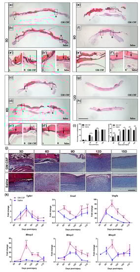 Furthermore, we examined the rate of re-epithelialization by H&E staining. The results showed that the GM-CSF group completed re-epithelialization at 9D, while the control group acquired intact dorsal neo-skin by the end of 12D (Figure 7a–i).