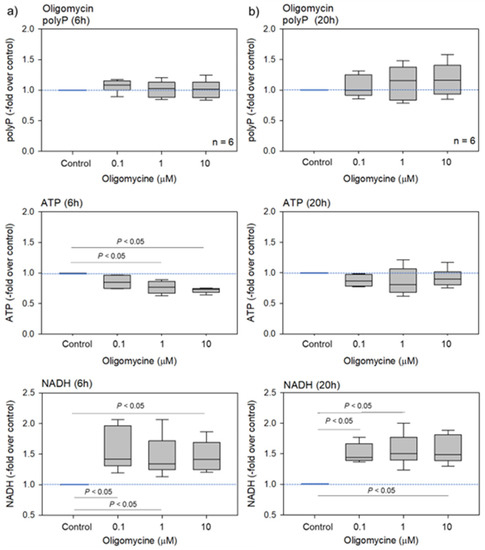 Oligomycin is a well-known inhibitor of mitochondrial F0F1-ATP synthase [11,12]; hence; it is expected to reduce platelet ATP levels. The effects of oligomycin on platelet polyP, ATP, and NADH levels are shown in Figure 1. As expected, platelet ATP levels decreased dose-dependently after 6 h but not after 20 h of treatment. Conversely, NADH levels increased in the oligomycin-treated platelets after 6 and 20 h of treatment. PolyP levels did not significantly alter after 6 h, but these levels gradually, but not significantly, increased in a dose-dependent manner after 20 h.