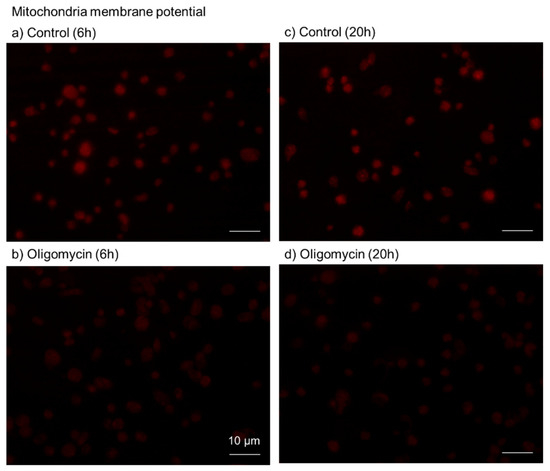 Based on previous studies [13,14], to confirm the inhibitory effects of oligomycin on mitochondrial respiration and consequent ATP production, the mitochondrial membrane potential (ΔΨM) was examined semi-quantitatively. The effects of oligomycin (100 μM) on fluorescence intensity at 6 and 20 h are shown in Figure 2. Oligomycin substantially reduced the ΔΨM; this inhibitory effect lasted for 20 h.