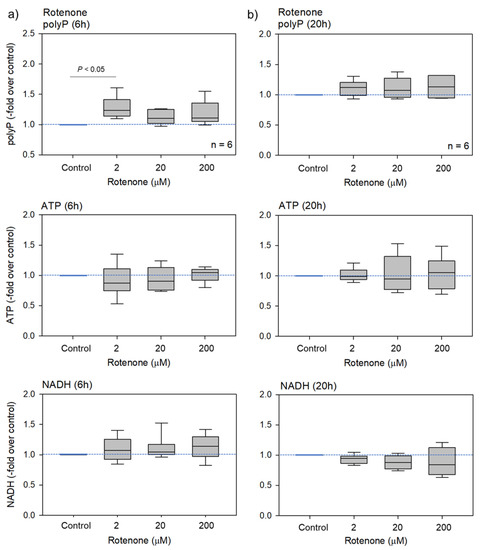 Since rotenone impairs the mitochondrial electron transport chain [12,13], this inhibitor likely reduces platelet ATP levels. The effects of rotenone on platelet polyP, ATP, and NADH levels are shown in Figure 3. Neither the platelet ATP nor NADH levels changed significantly. Furthermore, PolyP levels increased significantly only in response to the lower dose after 6 h; no significant effects were observed at higher doses or after 20 h of treatment.