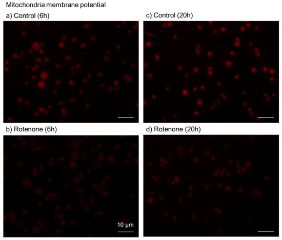 To confirm the inhibitory effects of rotenone on mitochondrial respiration and the consequent ATP production, ΔΨM was examined again, similarly to the case with oligomycin. The effects of rotenone (200 μM) on fluorescence intensity at 6 and 20 h are shown in Figure 4. As observed with oligomycin, rotenone substantially reduced ΔΨM; this inhibitory effect lasted for 20 h.