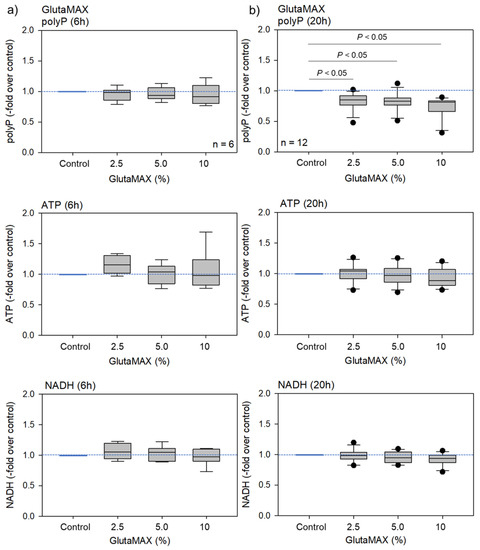 GlutaMAX is an l-alanyl-l-glutamine dipeptide that does not degrade into ammonia during prolonged storage or incubation [14]. GlutaMAX supplementation can be used as a direct substitute for L-glutamine, which drives oxidative phosphorylation (OXPHOS) to produce ATP [15]. The effects of GlutaMAX on platelet polyP, ATP, and NADH levels are shown in Figure 5. Neither the platelet ATP nor NADH levels changed significantly. PolyP levels significantly decreased after 20 h but not after 6 h of treatment.