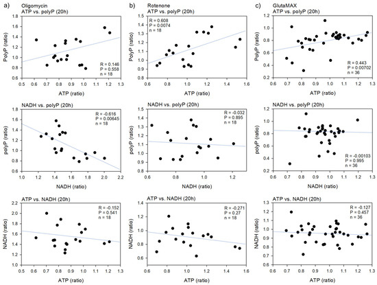 The correlations between polyP levels and ATP levels or NADH levels and between ATP levels and NADH levels in platelets treated with oligomycin (a), rotenone (b), or GlutaMAX (c) for 20 h. Spearman’s rank correlation coefficients were calculated for the evaluation of their correlations.