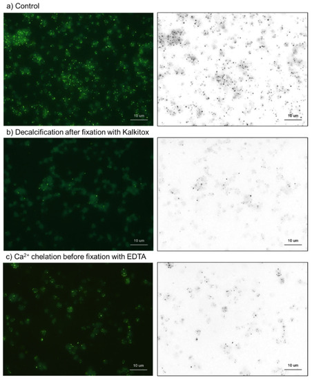 The effects of Kalkitox and EDTA on platelet polyP are shown in Figure 8. Kalkitox and EDTA were used to decalcify tissue samples to prepare paraffin-embedded specimens. Short-term treatment with undiluted Kalkitox or diluted EDTA (5 mM) significantly reduced the number of DAPI-reactive microparticles, whereas the reduction was less pronounced in faint staining. To easily recognize and compare the DAPI-reactive microparticles among the images, the right column of Figure 5 shows the black and white images converted from the red channel of the RGB images.