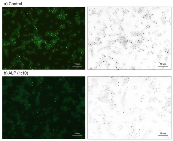 The effects of ALP on platelet polyP. Fixed platelets were treated with 0.3 U/mL (1:10) ALP for 8 h (b). The control was incubated in the specific buffer without ALP (a). Bar = 10 μm. Similar results were observed in four other independent experiments.