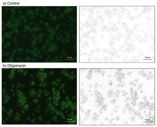 In the second half of this section, the biochemical data were validated using cytochemical analysis. The effects of oligomycin on platelet polyP levels are shown in Figure 9. As previously observed (Figure 1), 20-h treatment with oligomycin substantially increased the number of DAPI-reactive microparticles.