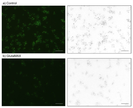 The effects of GlutaMAX on platelet polyP (green and black microparticles in left and right columns, respectively). Platelets were treated with 10% GlutaMAX (b) for 20 h. The control had no additions (a). Bar = 10 μm. Similar results were observed in four other independent experiments.