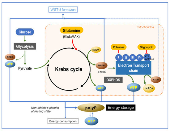Based on our current understanding of ATP, NADH, and polyP metabolism, we present a schematic diagram of our proposed mechanism for ATP-to-polyP conversion in Figure 12. Briefly, in platelets, ATP is generated mainly from glucose and also from glutamine through glycolysis and OXPHOS. When ATP is actively generated, the platelet NADH level decreases. A portion of the generated ATP is immediately used for energy-dependent cellular processes, while the rest is stored as ATP and polyP in the dense granules. When ATP is depleted, this polyP is cleaved to ATP to function as conventional energy fuel, and is also presumably capable of directly providing energy. The OXPHOS machinery is mainly localized in the mitochondria. However, it has also been suggested that the OXPHOS machinery is expressed in platelet membranous structures other than mitochondria [6]. This ectopic presence is needed to meet the higher energy demand of platelets, which are involved in both primary hemostasis and antimicrobial host defense [21].
