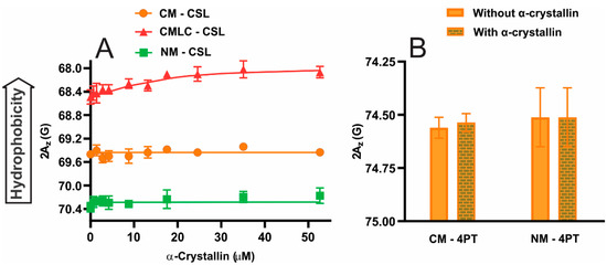 - Timsina, R.; Trossi-Torres, G.; Thieme, J.; O’Dell, M.; Khadka, N.K.; Mainali, L. Alpha-Crystallin Association with the Model of Human and Animal Eye Lens-Lipid Membranes Is Modulated by Surface Hydrophobicity of Membranes. Curr. Eye Res. 2022, 47, 843–853. [Google Scholar] [CrossRef]