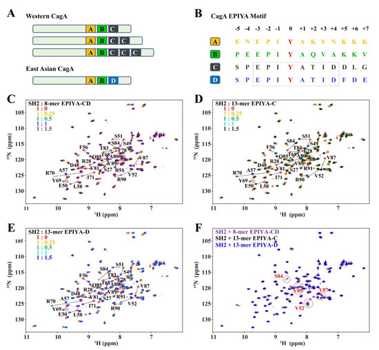 SHIP2-mediated PtdIns signaling can be hijacked by cytotoxin-associated antigen A (CagA)-positive Helicobacter pylori, a pathogen associated with the development of chronic gastritis, gastric ulcers, duodenal ulcers and gastric cancer [22,23]. CagA is a cytotoxicity-associated protein of H. pylori, and is injected into gastric epithelial cells by the bacterial type IV secretion system and then binds to the inner leaflet of the plasma membrane, where it is phosphorylated by host kinases at the Tyr residue in the Glu-Pro-Ile-Tyr-Ala (EPIYA) motif [24,25]. The phosphorylation enables CagA to interact with host SH2 domain-containing proteins and utilize their functions [22,26,27,28]. Four types of EPIYA motifs (EPIYA-A, EPIYA-B, EPIYA-C and EPIYA-D), differing in the sequence following the Ala residue, are present in various numbers and combinations in CagA from different H. pylori strains [29]. CagA in H. pylori strains isolated from Western countries generally contains tandem EPIYA-A, EPIYA-B and EPIYA-C motifs, with a difference in the copies of the EPIYA-C motif. On the other hand, CagA in H. pylori strains isolated from East Asian countries consists of EPIYA-A, EPIYA-B and EPIYA-D motifs (Figure 1A) [30]. SHIP2-SH2 showed strong binding to phosphorylated EPIYA-C motif in a previous co-immunoprecipitation study, while it also bound to the phosphorylated EPIYA-D motif, although less strongly than to the EPIYA-C motif [22]. Once CagA binds to and tethers SHIP2 to the plasma membrane, SHIP2 triggers an increase in the PI(3,4)P2 level, which strengthens the attachment of H. pylori to gastric epithelial cells; this, then, increases the delivery of CagA into the host cells to further induce the epithelial–mesenchymal transition-like phenotype that usually reflects enhanced cell motility and cell invasion potential. So far, the interaction mechanism between SHIP2-SH2 and the EPIYA motifs of CagA from the aspects of structure, affinity and key residues remains unclear.
