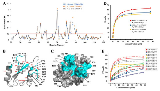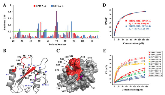 Further, alanine mutation-based analysis was performed to identify key SHIP2-SH2 residues for binding to EPIYA-C and EPIYA-D. Five residues in the pY-pocket, including R28, S49, E50, S51 and R70, and two residues in the electroneutral pocket, including S84 and Q107, were selected for mutagenesis, as referred to in the NMR titration data and the residues selected in our previous studies [13,21]. The binding affinities of these mutants for 13-mer CagA EPIYA-C and EPIYA-D phosphopeptides were determined by FP assay (Figure 2E). The KD values are summarized in Table 1. Among the mutants for the pY-pocket residues, R28A, S49A, S51A and R70A showed obvious reduced affinities for both 13-mer CagA EPIYA-C and EPIYA-D, suggesting that these residues are crucial for binding to the pY residue of EPIYA-C and EPIYA-D. E50A displayed decreased KD values for both EPIYA-C and EPIYA-D phosphopeptides, indicating increased affinities probably caused by reduced electrostatic repulsion, which was also found for Y1356-phosphorylated c-MET peptide and FcgR2B-ITIM phosphopeptide. For the two selected residues in the electroneutral pocket, the KD values for S84A and Q107A did not show a significant difference to WT for either EPIYA-C or EPIYA-D, which was similar to the case of c-MET but different to that of FcgR2B-ITIM phosphopeptide.